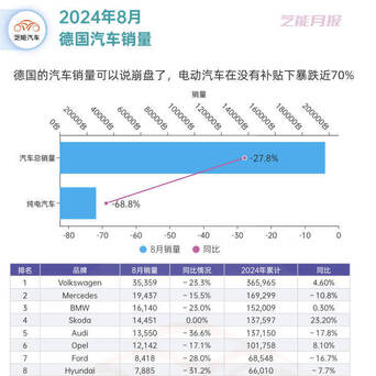 【8月德国汽车市场雪崩,电车销量下跌68.8%】2024年8月德国汽车市场下跌27.8%,纯电动汽车更是暴跌68.8%。大众T-Roc连续三月居首,但本月亮点是欧宝雅特,销量超大众高尔夫,这可是32年来首次!斯柯达表现也不错,同比稳定超奥迪,特斯拉及中国汽车制造商名爵、长城、比亚迪均暴跌。...